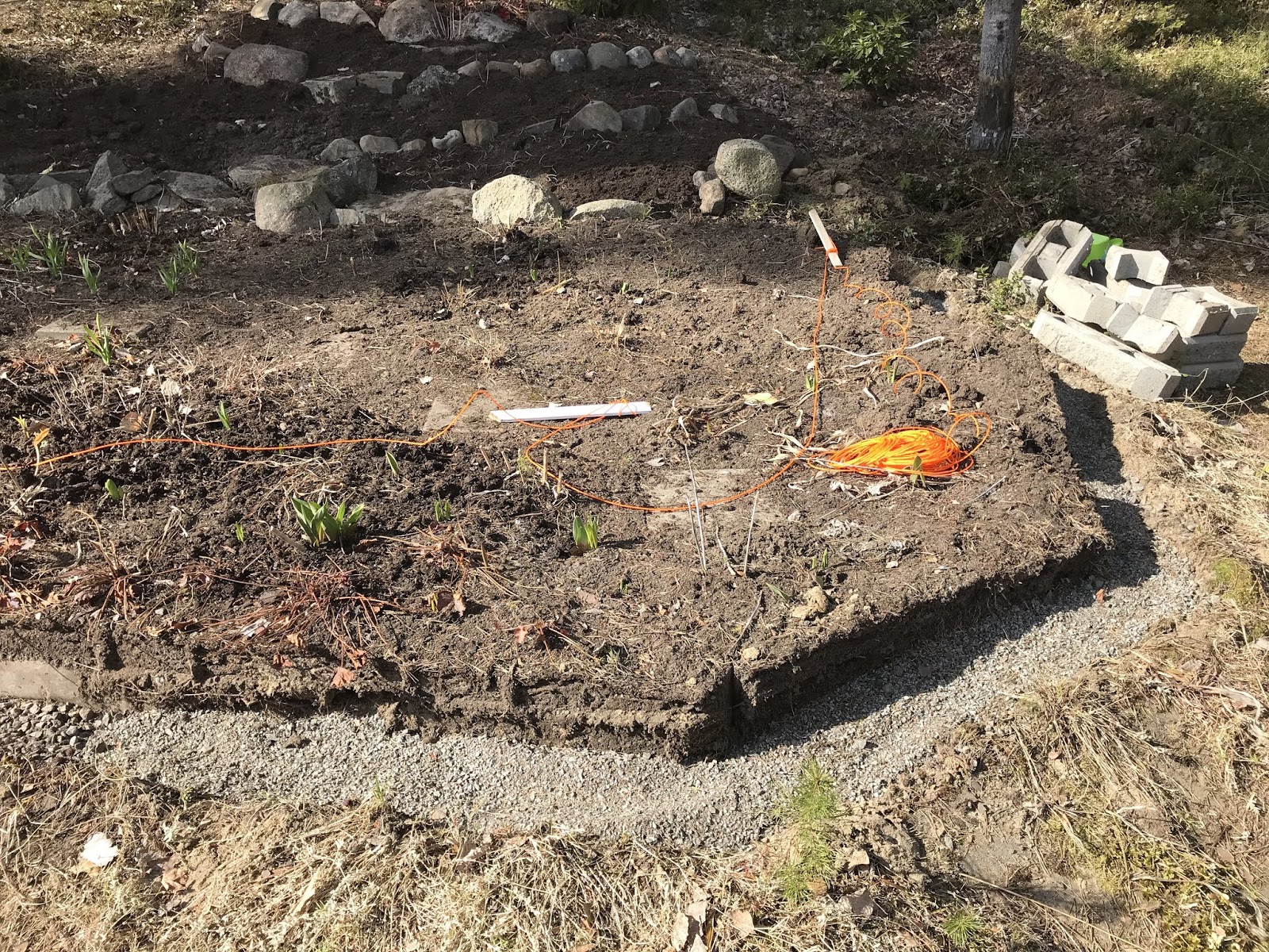 Siinäpä rakennusaineet. Muutaman sentin alla ollutta hiekkaa lapioin ensin pois koska tarkoituksena ei ollut korottaa penkkiä.