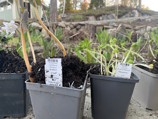 Sattuipa silmääni kerran kerrottu lumikki (sanguinaria canadensis). Siinäpä kukka joka täytyy puutarhaan saada. Viime vuonna melkein jo onnistuin lumikin hankkimaan kun Viherpeukalot juurakoita myi. Oma juurakkoni oli harmillisesti vain kuollut kuiva karahka joka ei koskaan lähtenyt kasvuun. Sain siitä sentään rahat reklamoimalla takaisin, olisi ollut kallis kolmenkympin kuollut juurenpätkä. Uutta ei samasta firmasta enää ollut saatavilla eikä muuallakaan Suomessa. Talvella katsoin että Eurobulbille pitäisi tulla myyntiin keväällä josta sipuleitakin olen kahteen otteeseen tilannut. Ilmeisesti oli sielläkin saatavuusongelmaa koska yhtäkään eivät myyntiin sitten verkkokauppaan asti laittaneet. Maaliskuulla jälleen googlailin ja onnistuin löytämään noita myyvän ruotsalaisen taimikaupan Odlarglädjenin joka myi myös Suomeen. Kohtuuttoman hintava taimi olisi postimaksuineen tullut ilman kavereita joten muutama muukin taimi tuli kylkiäisenä tilatuksi. Sivustoilla ohjeistettiinkin tilausvaiheessa että sähköpostitse ilmoittavat ulkomaankuljetuksen vaativaa lisämaksua varten tilinumeron. Siihen sitten vastatessani tuli virkistettyä näemmä hyyyvin ruosteessa olevaa ruotsin kielen kirjoitustaitoani 😬, ymmärrys sentään vielä lukemiseen kohtuullisesti riitti. Ilmiesesti sanakirjaruotsini oli riittävän ymmärrettävää ja torstaina taimet viimein postiin saapuivat ja pääsin istutushommiin.