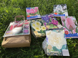 Tulppaanilajiltelma tarttui matkaan. Tulppaanit Claudia, Purple Prince, Blue Diamond, Flaming Prince ja Parrot Prince. Nämä jäänevät lähinnä yksivuotiseksi iloksi. Eurobulbin tilaus keskittyikin tulppaanien osalta enemmän Darwin-hybrideihin joten muutama muukin tulppaanilajike voi olla ihan kiva lisä ensi kevään kukintaan.
